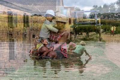 PROPER Noro (42 ans) et sa fille Nasy (3 ans) observent l’eau des rizières encercler petit à petit ce groupe de dames venu nettoyer le linge ensemble. Pratique pour travailler à 360°C ! Double exposition Ambotromanjaka 2020