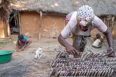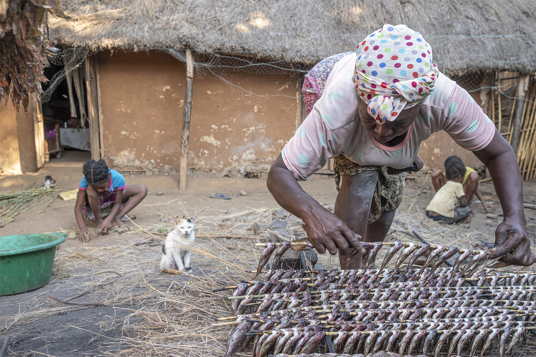 CONSERVATION BY GENERATION Justine (57 ans) embroche les poissons du lac Alaotra afin de les sécher. Une partie sera vendu, l’autre sera stockée pour la famille. Pendant ce temps, les jeunes filles jouent au “Tantara”, utilisant des pierres pour animer les histoires qu’elles s’inventent. Ambatodrasaka, 2021